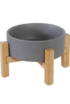 Ceramiczna miska dla psów i kotów w eleganckim wzornictwie. Miska stoi na bambusowej podstawce, która jest wyposażona w antypoślizgowe podkładki.