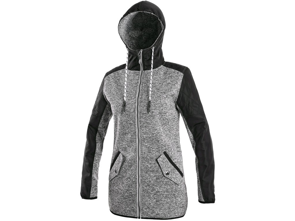 Dámská bunda z pleteniny, prodloužená, kombinace materiálů, kapuce napevno, zapínaní na zip, rukávy zakončeny gumičkou, 2 boční kapsy. przeczytaj całość