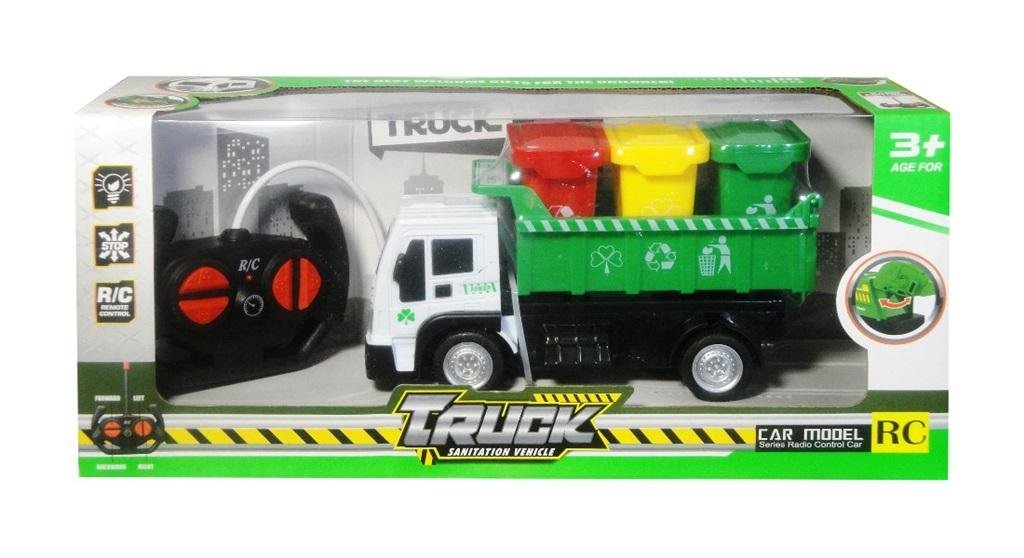 Ciężarówka śmieciarka sterowana pilotem z ruchomymi częściami. Zabawka świeci kolorowymi światełkami, porusza się do przodu, do tyłu, skręca w prawo i w lewo. Zabawka działa na baterie typu AA. Baterie nie znajdują się w zabawce. Produkt zapakowany w kartonowe opakowanie z przezroczystym okienkiem. Zabawka przeznaczona dla dzieci od 3 lat. Podane wymiary są wymiarami opakowania.