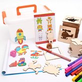 Obkreslovací dřevěné šablony 100 ks – kreativní set s fixami, tužkou, ořezávátkem a gumou