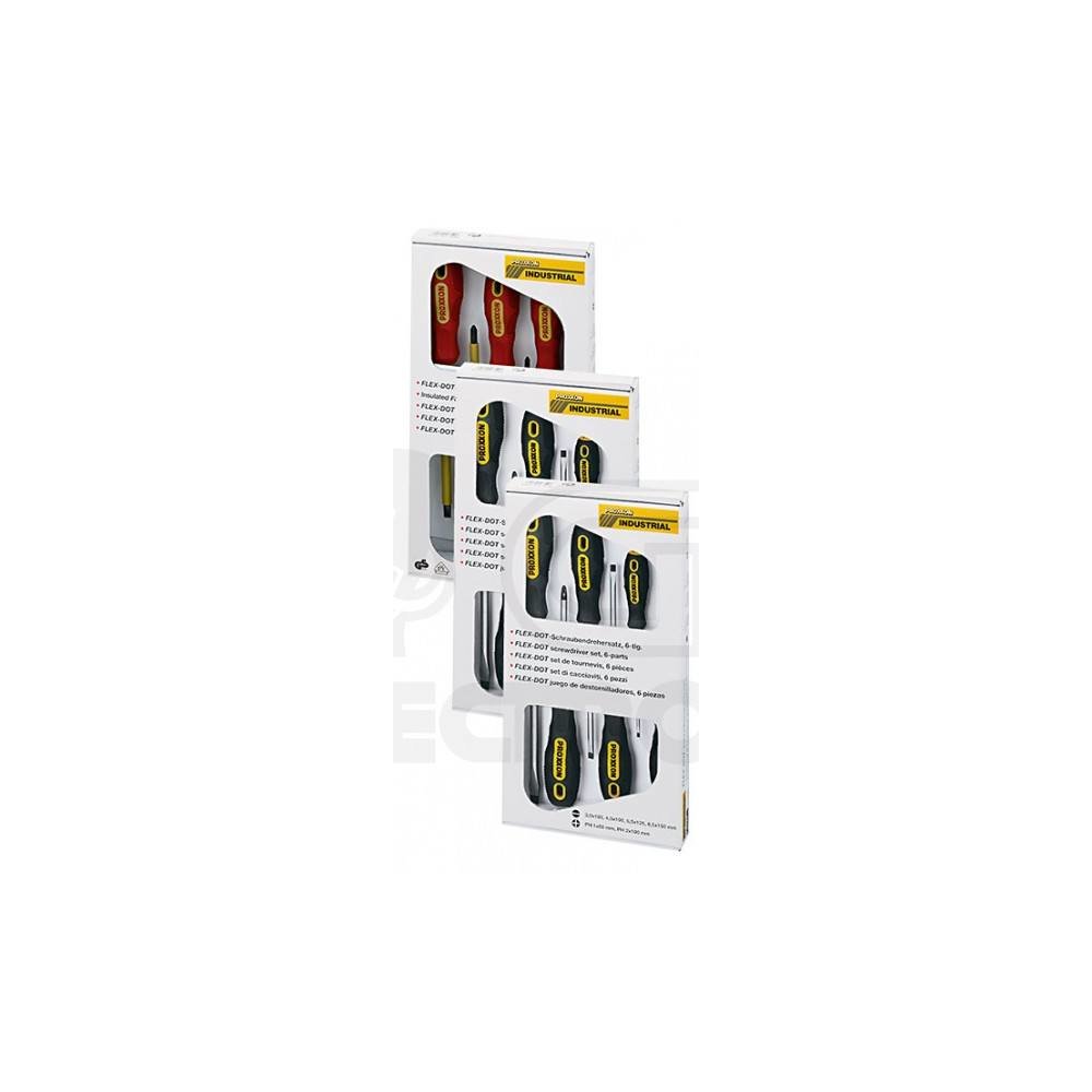 Dřík šroubováku FLEX-DOT je vyroben z chrom-křemík-manganmolybdenové oceli s matných chromem a jeho velikost je zřetelně označena laserem. Přesně opracované černěné čepele šroubováků zabraňují sklouzávání při použití nástroje. Zaoblená, dvouplastová ergonomická rukojeť s výstupky „FLEX-DOT®“...