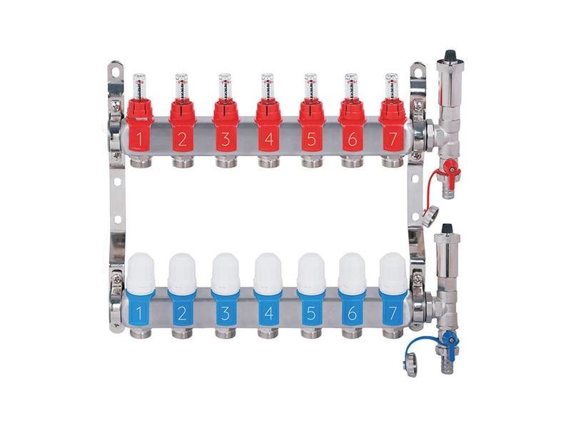 Nerezový rozdělovač hranatý - 7-cestný - průtokoměry, termostat. ventily, automat. odvzd. ventily, připojení 1" závit