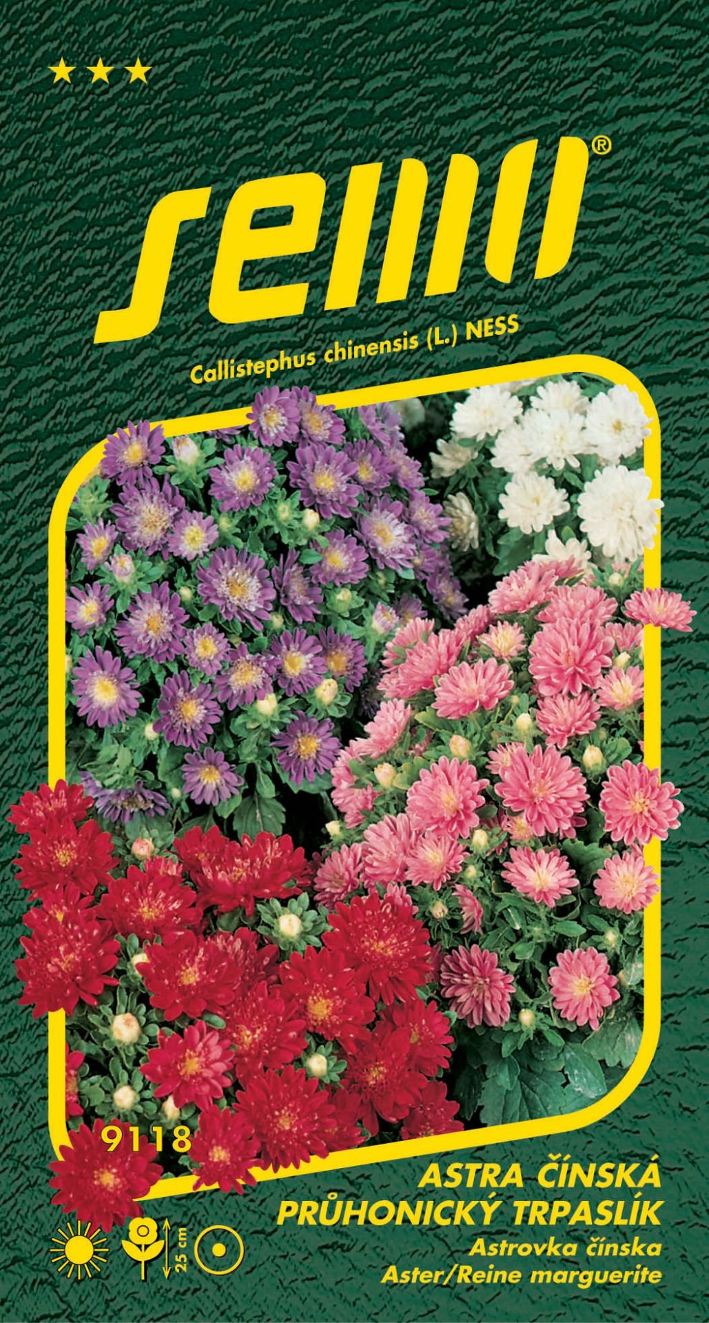 Callistephus chinensis ( L.) NEES / Astrovka čínskaPopis:Vzpřímeně rostoucí větvená letnička určená zejména k řezu a k záhonovým výsadbám. Listy jsou vejčité, zubaté. Vyžaduje slunné stanoviště. Nedoporučujeme přímé organické hnojení. Každoroční střídání stanoviště zabrání rozšíření fuzariózy...
