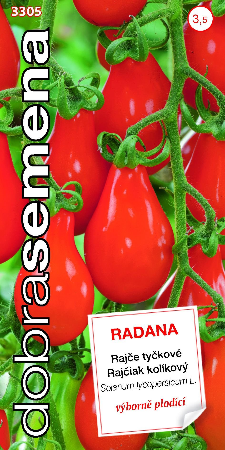 Solanum lycopersicum L. / Rajčiak kolíkovýPopis:RADANA – tyčkové rajče s drobnými, hruštičkovitými plody červené barvy. Poloraná, spolehlivá odrůda pro hobby pěstitele. Bohatě větvené vijany nesou velké množství menších plodů o hmotnosti 15 – 20 gramů.Popis SK:RADANA – kolíkový rajčiak s...