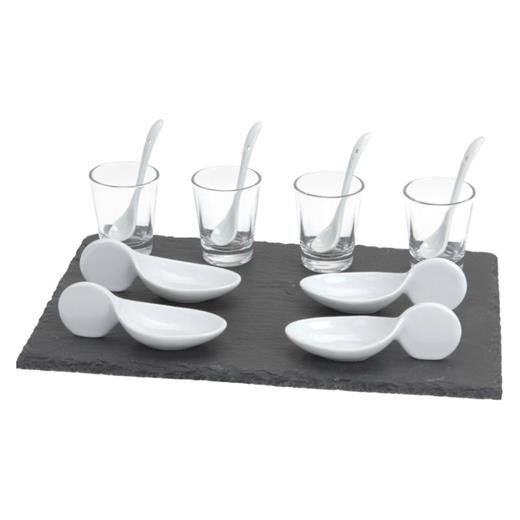 Servírovací set Excellent využijete pro nejrůznější příležitosti. V balení najdete 4 misky kanapky, 4 porcelánové lžičky, 4 skleničky a 1 podnos z břidlice. V miskách podáváte předkrmy, dipy, omáčky a jiné pochutiny. Pohodlně je hromadně přenesete na stůl. Praktický podnos s protiskluzovými...