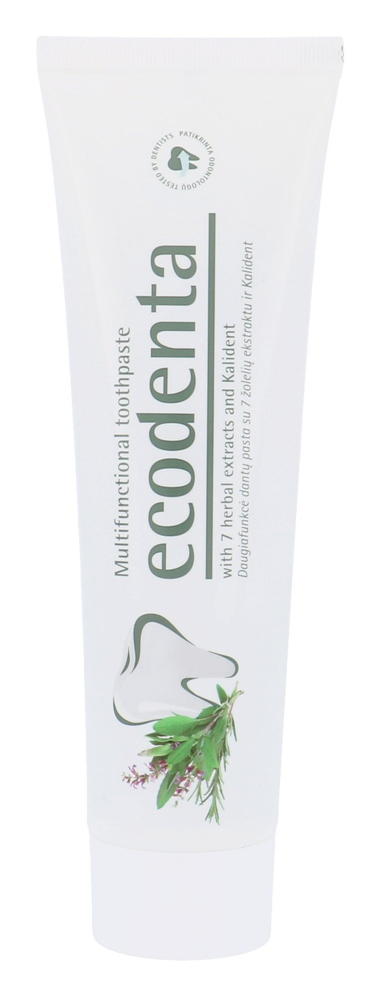 Pasta do zębów **Ecodenta Multifunctional Toothpaste**. Pasta do zębów Ecodenta Multifunctional Toothpaste do kompleksowej pielęgnacji jamy ustnej. Pasta do zębów Ecodenta Multifunctional Toothpaste dba o Twoje zęby, dziąsła oraz świeży oddech. Zawiera ekstrakty z 7 ziół, które pielęgnują zęby i chronią je przed podrażnieniami. Jednocześnie odświeża usta i pozostawia je chronione. **Składniki aktywne**: · Kalident® · ekstrakty z 7 ziół - krwawnik, rozmaryn, pokrzywa, szałwia, brzoza, skrzyp polny, lipa