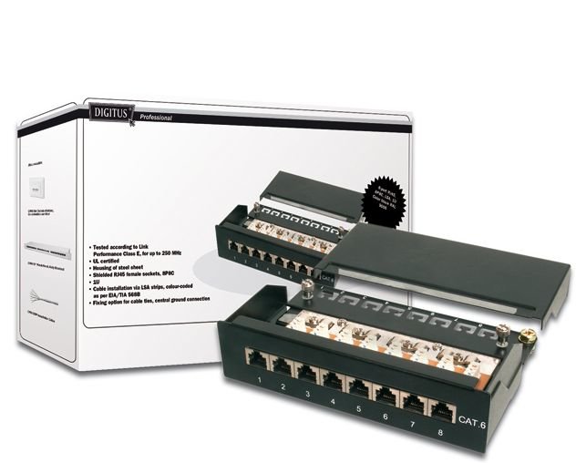 Patch panel, CAT6, desktop provedení, 8x STP RJ45, černá barvaPanel s osmi zásuvkami RJ45, CAT6, pro položení na stůl či polici Testováno pro třídu E, až do 250 MHz UL certifikovánoPouzdro a stínění ocelovéStínění RJ45 female konektory, 8P8C výška pouzdra 1U Instalace kabelů pomocí LSA stripů,... przeczytaj całość