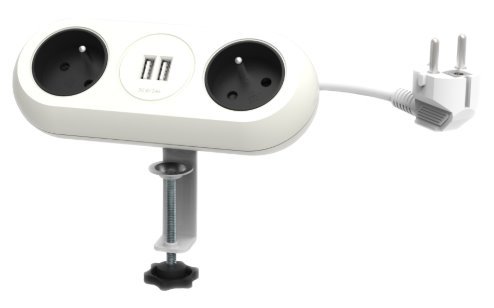 Gniazdko biurkowe ze zaciskiem, 2x gniazdo 230V, 2x ładowanie USB, kolor biały, przewód 1,4 m z wtyczką