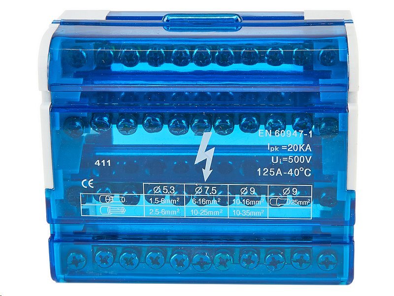 Distribuční blok VCX BLK 411 / 4 póly / 11 otvorů / 125A / na DIN lištuDistribuční nebo také rozvodný blok s mosaznými šrouby pro správné a přehledné připojení kabelů v nízkonapěťových rozvodnách.Modulární rozvodné bloky VCX jsou určeny k rozvodu proudových cest v nízkonapěťových skříních....