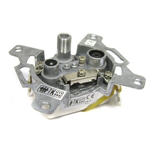Satelitní / Televizní / Rádio průběžná zásuvka s průchozím útlumem 1,5 dB a odbočovacím 10 dB.