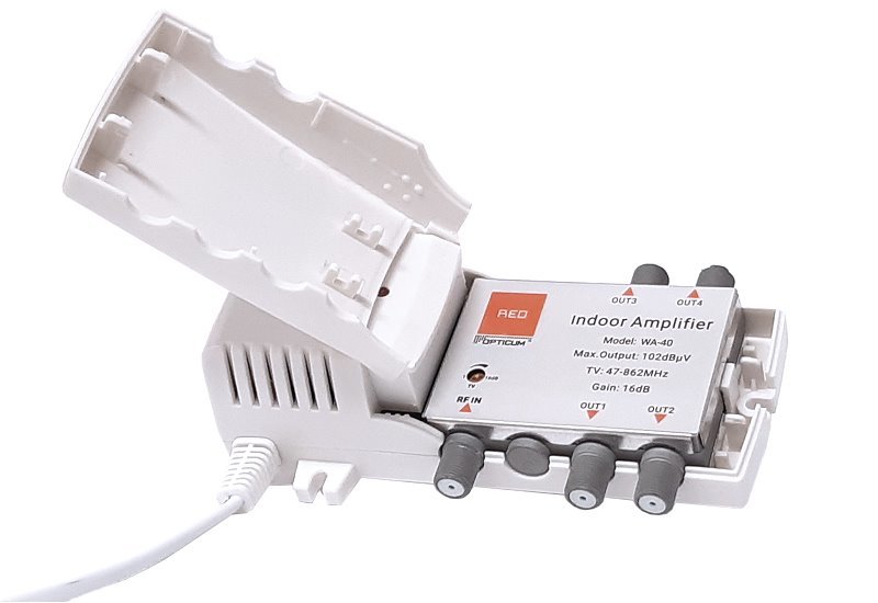 OPTICUM WA-40 domovní zesilovačDomovní zesilovač s jedním širokopásmovým vstupem a čtyřmy výstupy. Je vhodný pro použití jako bytový zesilovač v kabelových rozvodech s možností rozbočení signálu až na 4 místa.Zesilovač je vyroben v ZAMAC odlitku, který má vynikající stínící účinky a je kryt...