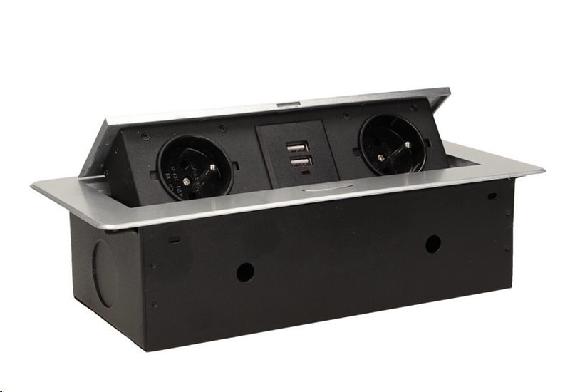 Ten wysuwany moduł gniazd w matowym, srebrnym wykończeniu został zaprojektowany do zabudowy w stołach lub blatach roboczych i może być montowany zarówno pionowo, jak i poziomo. Dzięki 2 standardowym gniazdom sieciowym 230V oraz 2 portom USB o napięciu 5V DC / 2,1A zapewnia wszechstronne możliwości zasilania. Solidny i trwały materiał ze stopu cynku oraz blacha stalowa gwarantują długą żywotność i bezpieczeństwo użytkowania.