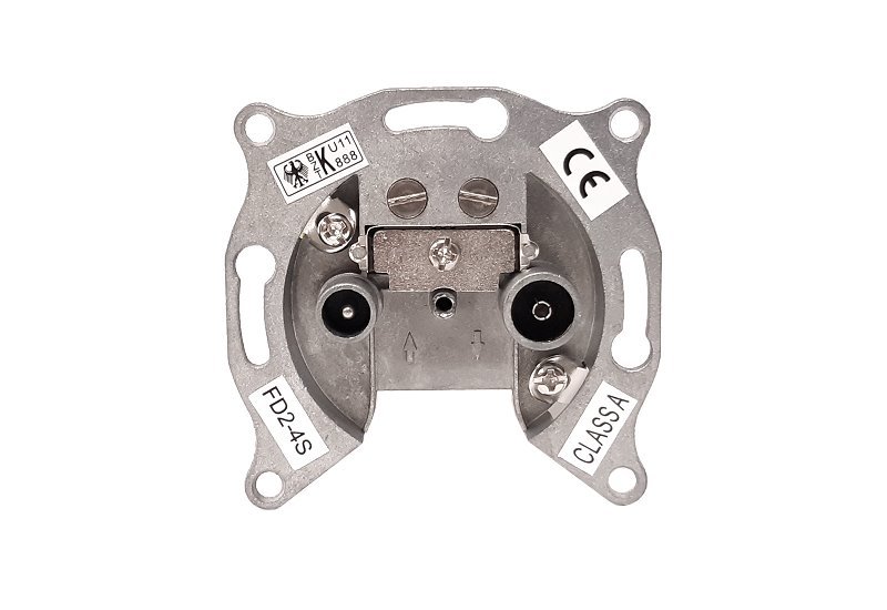 Televizní / Rádio průběžná zásuvka, průchozí útlum 2 dB, odbočovací útlum 4 dB.
