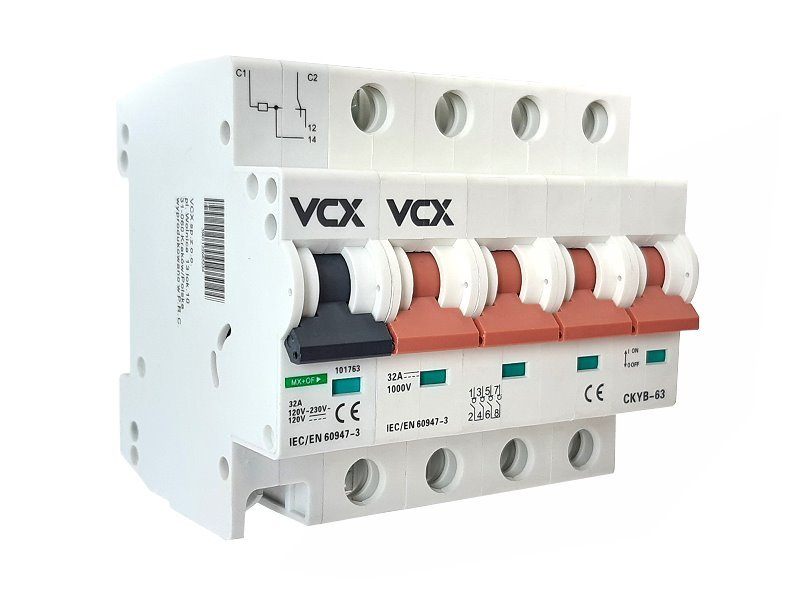 Odpínač s vypínací spouští VCX CKYB63+MX+OFF PV 4P 32A 1000V DC na DIN lištu4-pólový odpínač s vypínací spouští slouží k odpojování fází a odpojování napájení konkrétních částí instalace. Využítí u fotovoltaiky - k připojení nebo odpojení měničů DC / AC nebo jiných částí obvodu stejnosměrného...