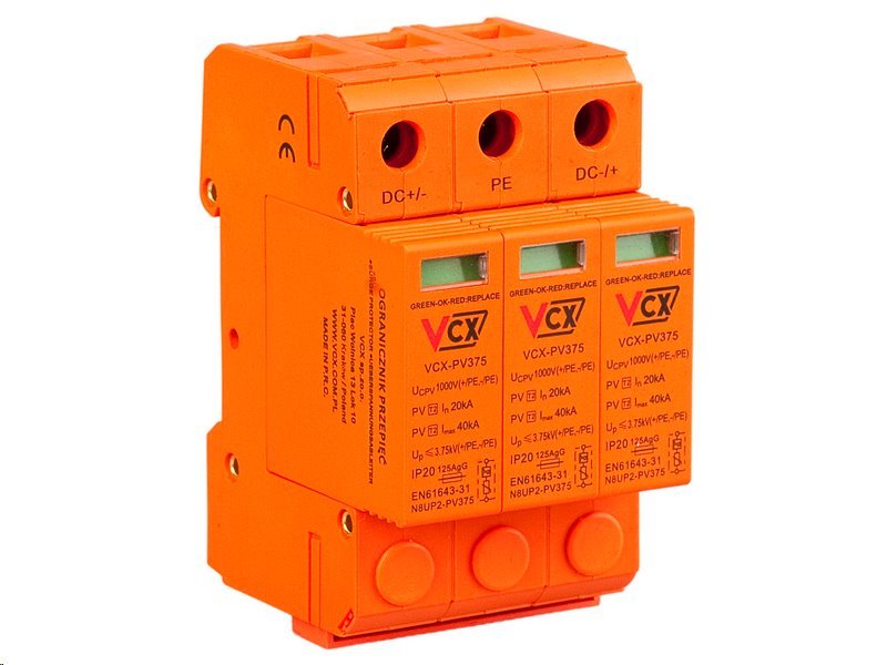 Přepěťová ochrana VCX PV375-3 DC třída T2 (C) 3P 1000V Professional PlusTechnicky vyspělá přepěťová ochrana nejvyšší kvality určená pro ochranu fotovoltaických zařízení fungující jako ochrana přepětí třídy C. Vybavená vizuálním indikátorem provozu (zelená - ochrana, červená - bez...