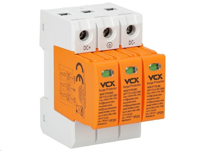 Přepěťová ochrana VCX DC třída T1T2 (B+C) 3P 1200V 12.5kA REDTechnicky vyspělá přepěťová ochrana vysoké kvality s jiskřištěm fungujícím jako ochrana proti přepětí třídy B a C. Určená pro ochranu fotovoltaických zařízení. Vybavený vizuálním indikátorem provozu (zelená - ochrana, červená - bez...