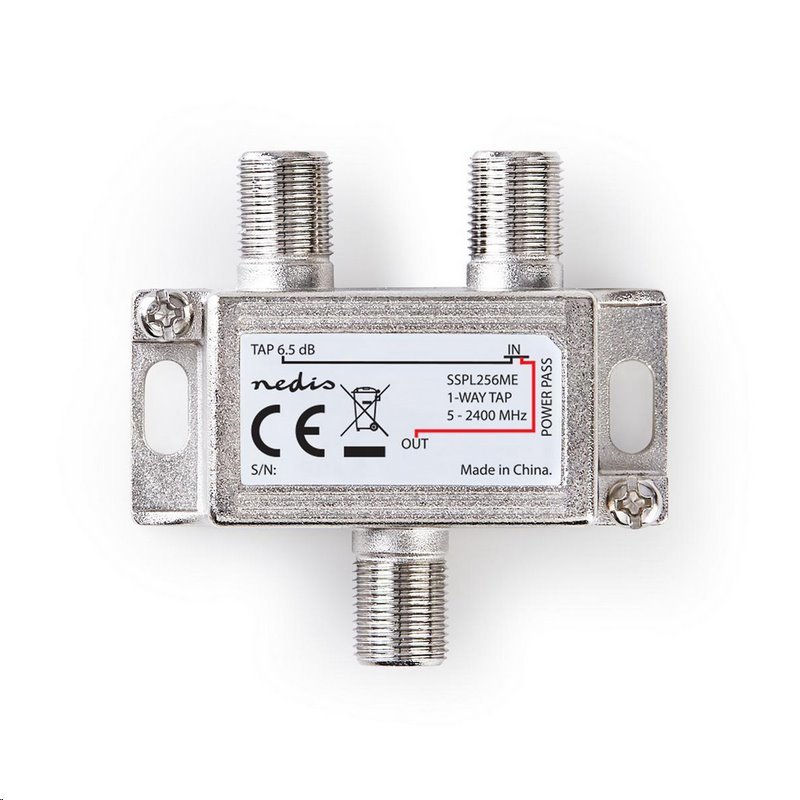 Odbočovač NEDIS 1xF - 2xF, 5-2400 MHz, 6dBOdbočovač SAT/TV signálu, 1 směr, 5 - 2400MHz, odbočovací útlum 6 dB. Využití pro instalace do STA a kabelových rozvodů. • Odbočovač je umístěn v pocínovaném odlitku se stíněním. • Vstupy a výstupy jsou na F-konektory.• Průchod pro napájení.Technické...