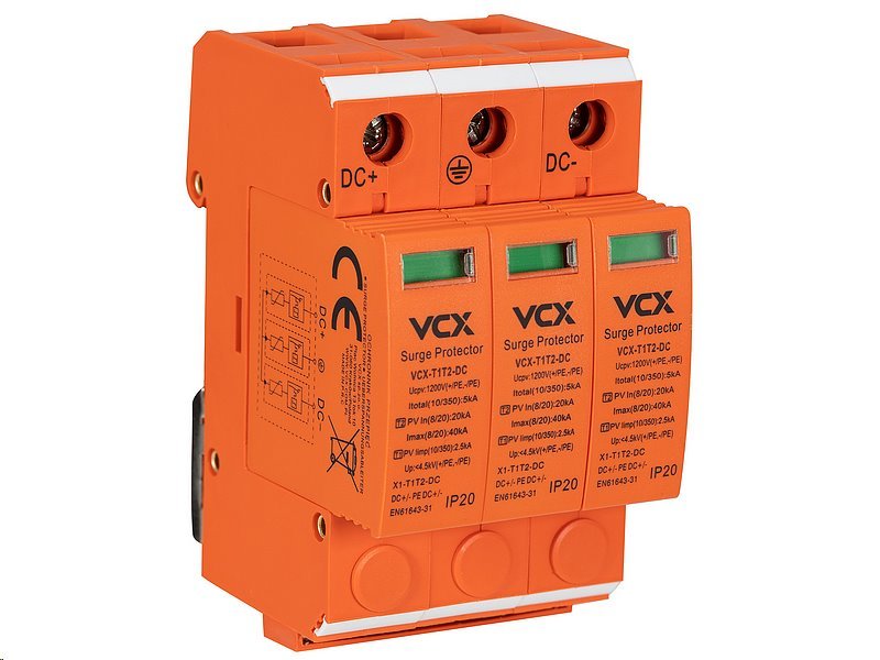 Přepěťová ochrana VCX DC třída T1T2 (B+C) 3P 1200V 5kA Professional PlusTechnicky vyspělá přepěťová ochrana nejvyšší kvality určená pro ochranu fotovoltaických zařízení fungující jako ochrana přepětí třídy B a C. Vybavený vizuálním indikátorem provozu (zelená - ochrana, červená - bez ochrany)....