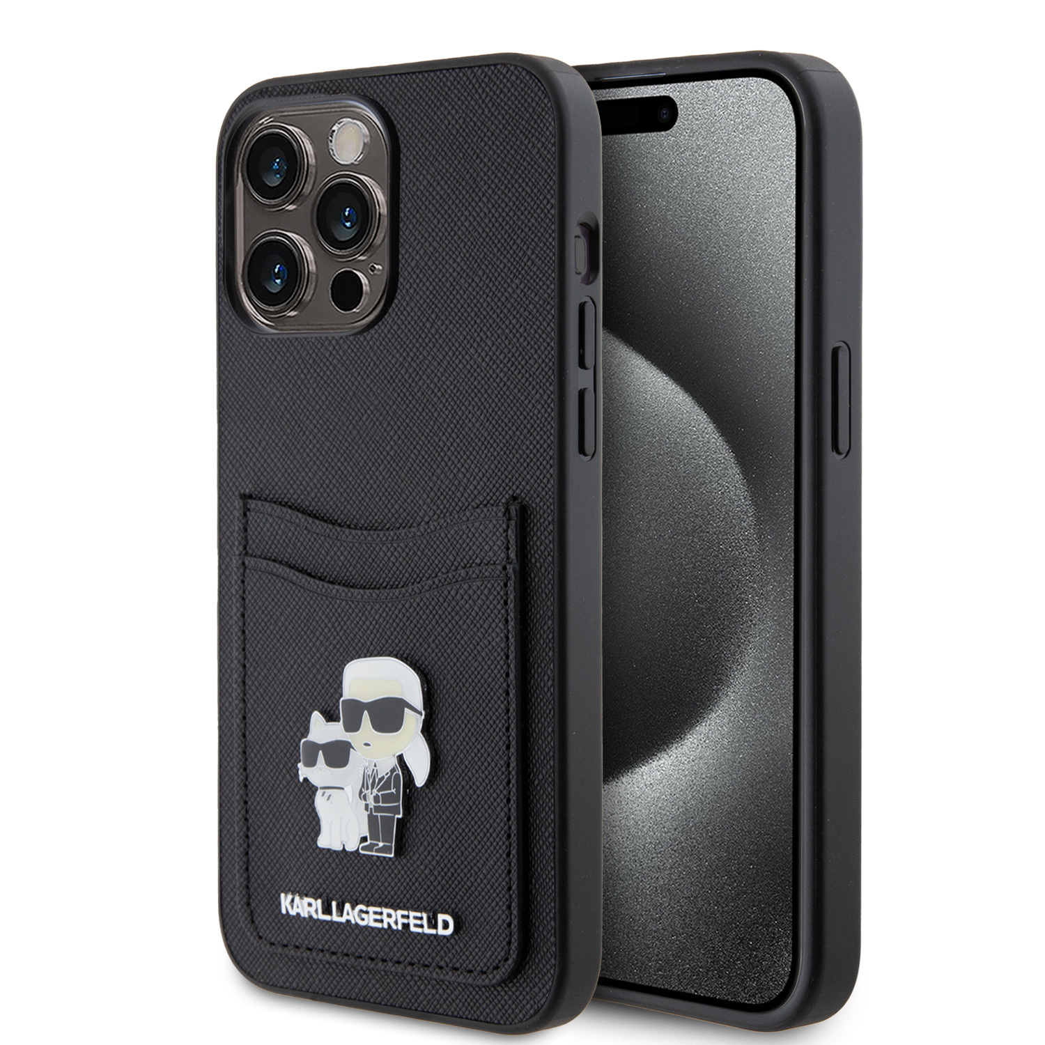 Karl Lagerfeld PU Saffiano Card Slot Metal Karl and Choupette Zadní Kryt pro iPhone 15 Pro Max Black