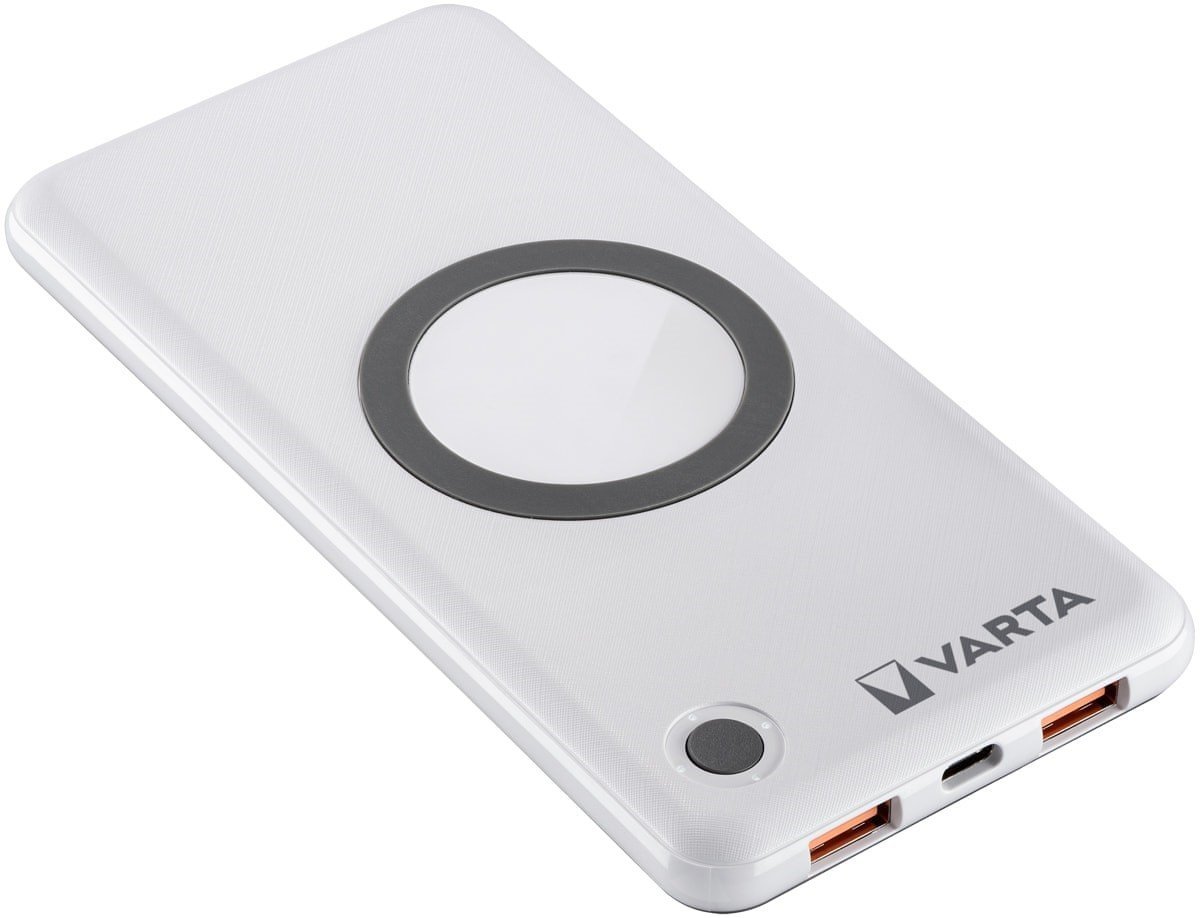 Varta powerbanka s kapacitou 10000mAh a bezdrátovým nabíjením a dvěma výstupy pro nabíjení až dvou zařízení současně.