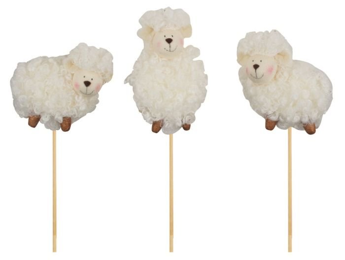 Bílá kudrnatá ovečka na špejli. Ovečka pěkně vynikne jako dekorace na věnci či vazbě, nebo ji můžete jednoduše zapíchnout například do květináče. 3 motivy pro výběr. przeczytaj całość