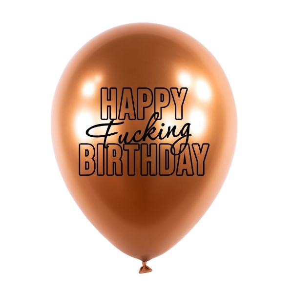 Sada chromových balonků s potiskem Happy Fu.king Birthday v měděné barvě v jantarovém odstínu. Balonky se díky svému nápisu hodí na vtipnou oslavu narozenin pro dospělého. Balení obsahuje 5 kusů potištěných 30 cm balonků, které jsou vhodné na nafukování heliem i vzduchem.
