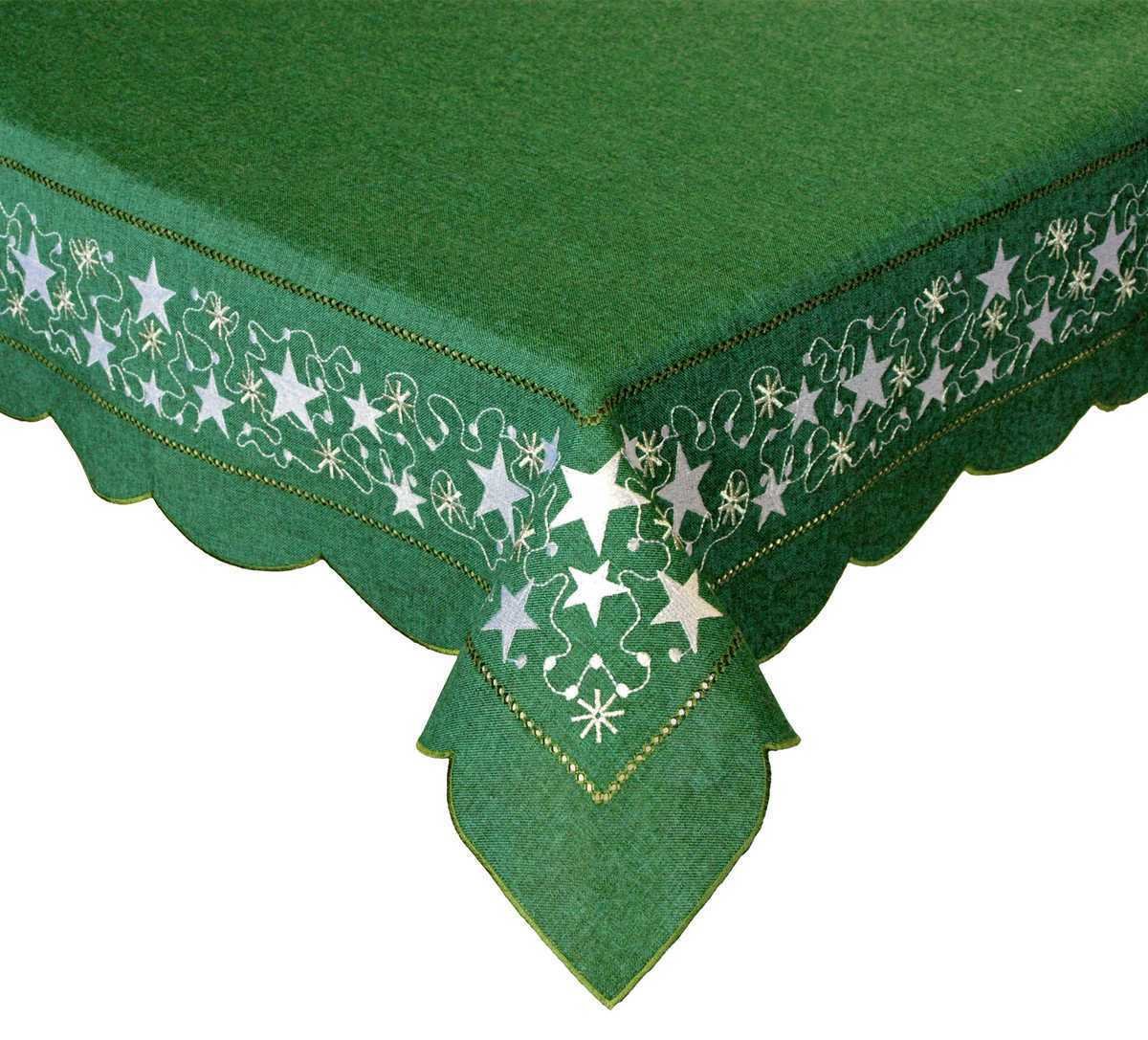 Elegantní Vánoční ubrus s moderním vzorem stříbrných hvězd vytvoří příjemnou sváteční atmosféru.Pro vánoční tabuli se nejčastěji používá dle velikosti stolu 1 až 2 ks velkého ubrusu a pod talíř prostírku dle počtu osob.Materiál: 100 % polyesterBarva materiálu: zelenáBarva výšivky: stříbrná,...