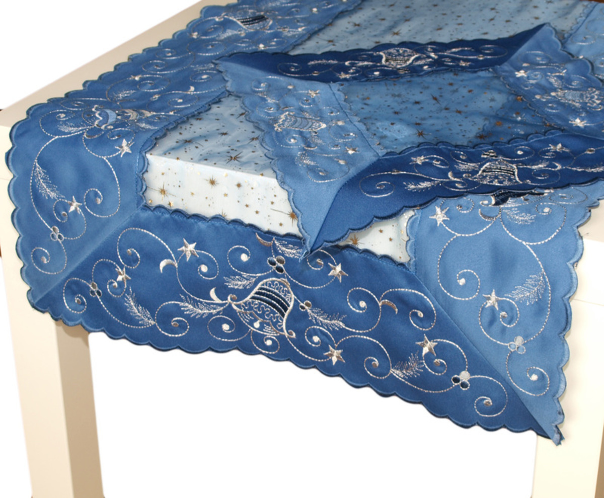 Vyšívaný vánoční ubrus v exclusivním provedení nádherné výšivky na hustě tkaným modrým saténu a jemné modré průsvitné organzy uvnitř ubrusuMateriál: 100% polyester Barva materiálu: modrýBarva vzoru: stříbrná a zlatá Různé rozměry przeczytaj całość