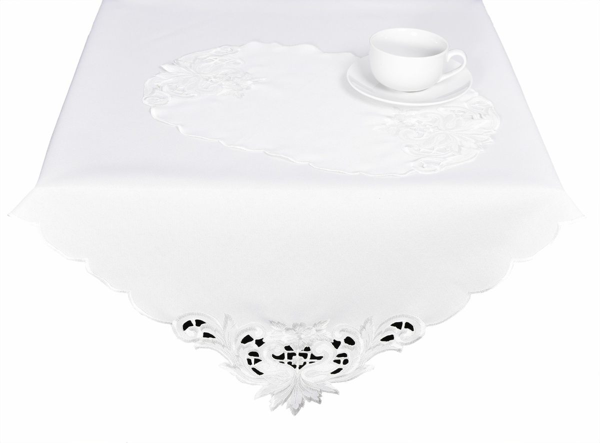 Nádherný vyšívaný ubrus s příjemným decentním ornamentálním vzorem dokonale působí na prostřeném stole.Materiál: 100 % polyesterBarva materiálu: odstín bílýBarva výšivky: odstín bílýCY5830-6M przeczytaj całość