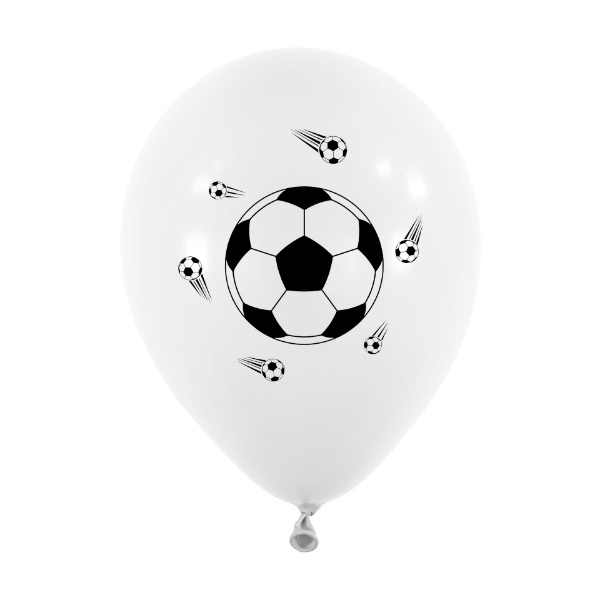 Zestaw pastelowych baloników w białym kolorze z nadrukiem piłki nożnej. Baloniki mają dwustronny nadruk i są przeznaczone na przyjęcia urodzinowe, chłopięce imprezy oraz inne okazje o tematyce piłkarskiej. Opakowanie zawiera 5 sztuk balonów z nadrukiem o średnicy 30 cm, które nadają się do napełniania helem i powietrzem. Objętość całego bukietu: ok. 80 l Objętość 1 szt. balonika: ok. 16 l Napełnianie: powietrze lub hel Czas utrzymania helu w baloniku lateksowym bez użycia żelu: 16 godz. Czas utrzymania helu w baloniku lateksowym po zastosowaniu żelu: ok. 3 dni Materiał: lateks Opakowanie handlowe: Tak Opakowanie: 5 szt.