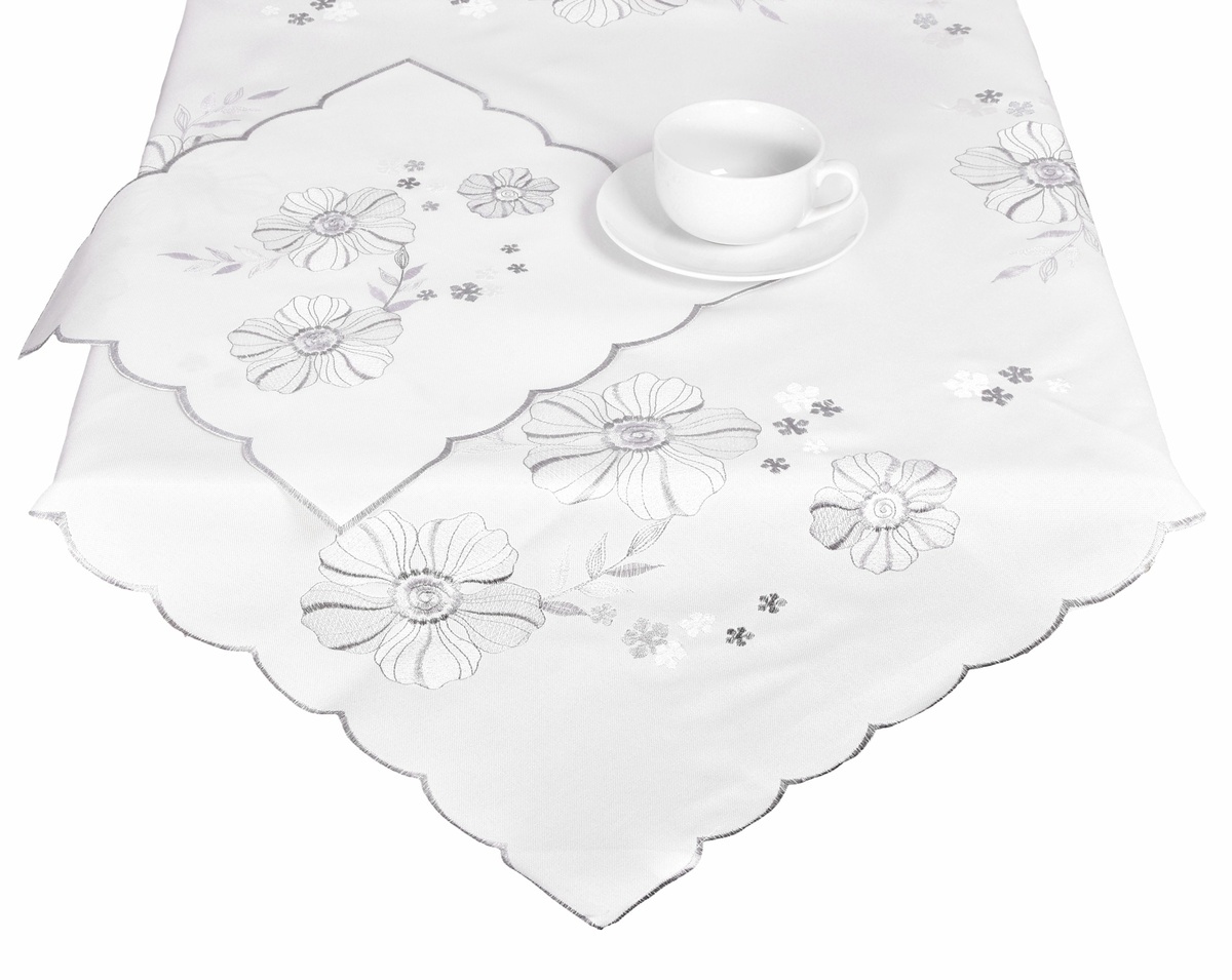 Nádherný vyšívaný ubrus s příjemným decentním vzorem květů a listí v krásné šedobílé výšivce dokonale působí na prostřeném stole.Materiál: 100 % polyesterBarva materiálu: bílosmetanováBarva výšivky: odstíny bílé, šedéCY 5761-1MRozměr 40 x 85 cm je v oválném tvaru przeczytaj całość
