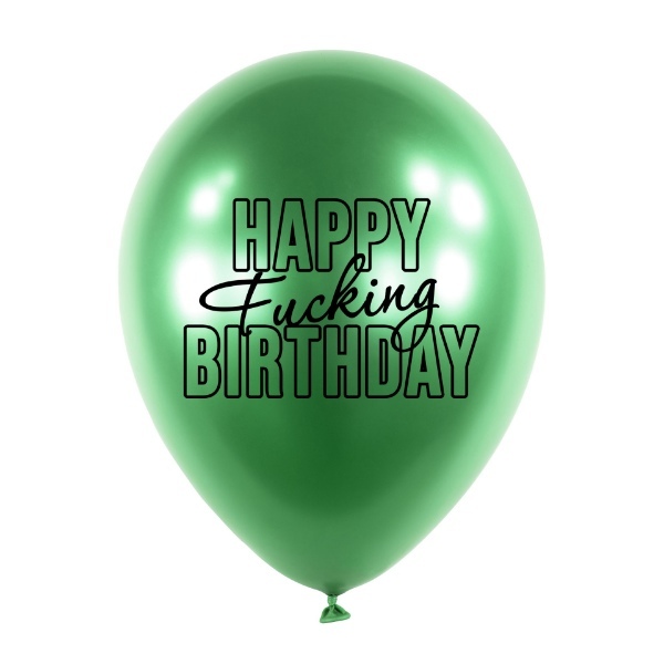 Sada chromových balonků s potiskem Happy Fu.king Birthday v zelené barvě. Balonky se díky svému nápisu hodí na vtipnou oslavu narozenin pro dospělého. Balení obsahuje 5 kusů potištěných 30 cm balonků, které jsou vhodné na nafukování heliem i vzduchem.