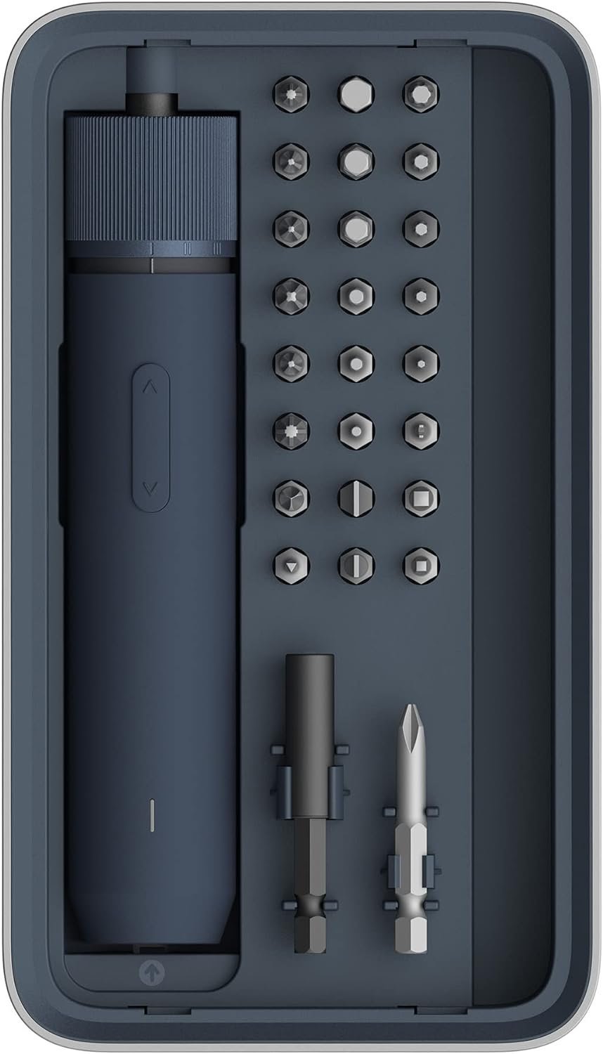 Šroubovák a bity jsou uloženy v obdélníkovém pouzdře, které...