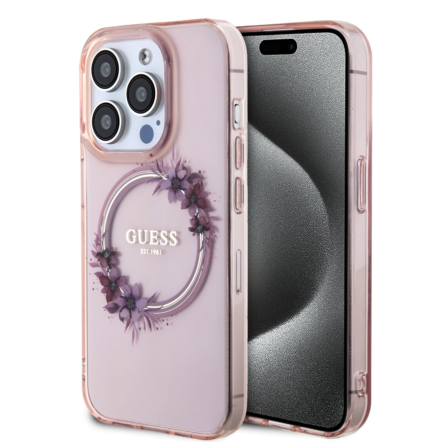 Guess PC/TPU Flowers Ring Glossy Logo MagSafe Zadní Kryt pro iPhone 15 Pro Pink