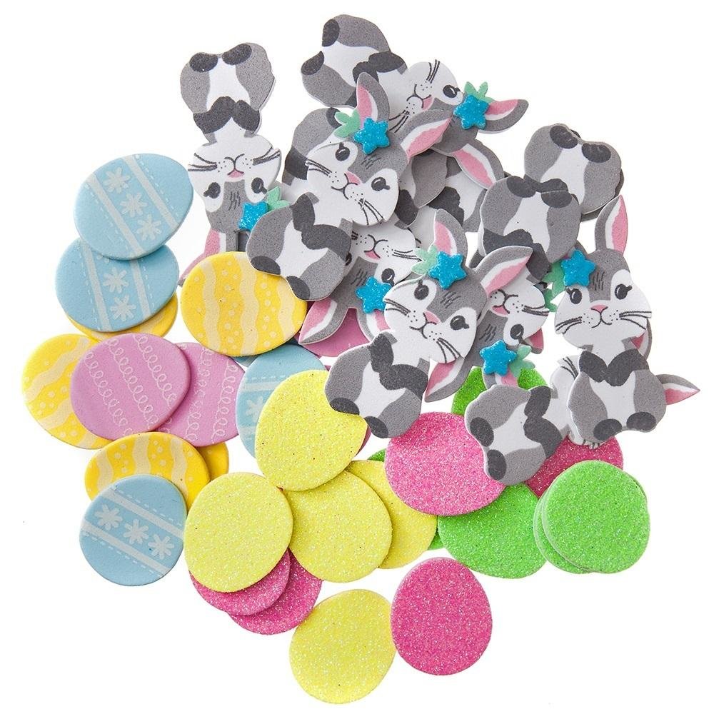 Tworzysz z dzieckiem kartki wielkanocne? Wasze prace wzbogacą naklejki z pianki, wśród których znajdziecie króliczki i pisanki w pastelowych kolorach. Niektóre z nich dodatkowo ozdobione połyskującymi drobinkami brokatu, co z pewnością spodoba się małym artystom.Świetne do dekoracji koszyczków...