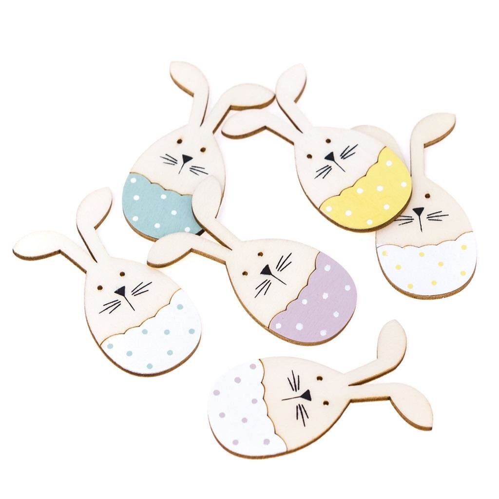 Drewniane króliczki w pisankach sprawdzą się świetnie jako elementy dekoracyjne do rozmaitych projektów wielkanocnych. Wykorzystasz je z powiedzeniem przy tworzeniu świątecznych kartek, wiszących dekoracji na obręczy, wieńców oraz stroików.Każdy z króliczków w zestawie ma inny kolor pisanki....