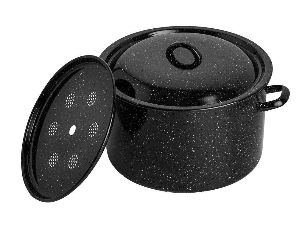- Wyposażenie: emaliowana pokrywka, emaliowane uchwyty, perforowana wkładka