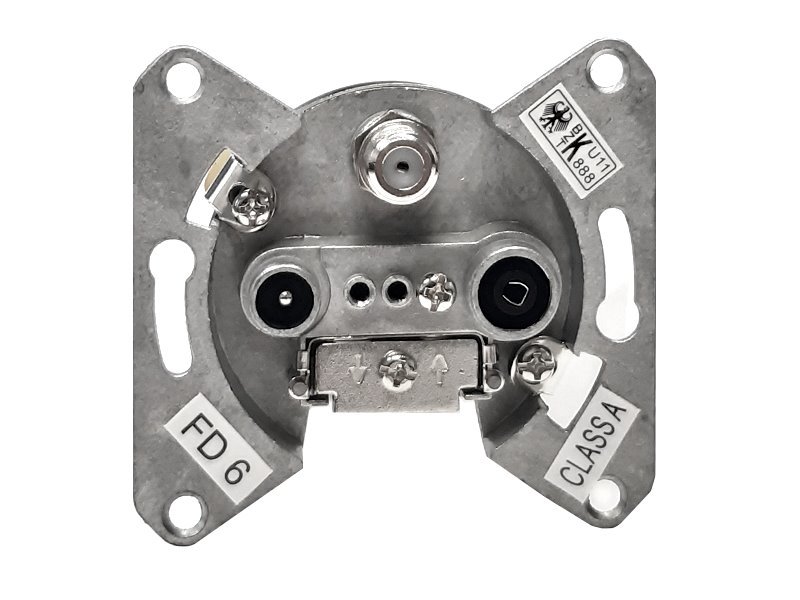 Koncová SAT + TV + R zásuvka FD 6Velmi kvalitní koncová satelitní účastnická zásuvka třídy CLASS A. Průchozí pro DC napájení. Velmi nízký útlum. Technická specifikace Odbočovací útlum dB Back channel (4-30) AM 0,5-26,1 MHz 1,5 Band I 47-68...