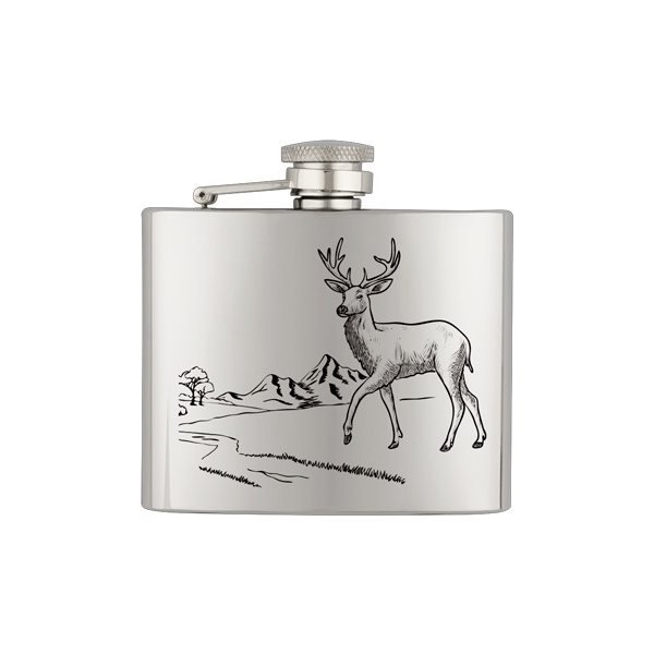 Placatice na nápoje, na jejíž přední části je obrázek krajiny s jelenem. Šroubovací víčko zajištěné k tělu placatky, abyste ho po odšroubování neztratili. Objem - 120 ml, materiál - nerezová ocel. przeczytaj całość
