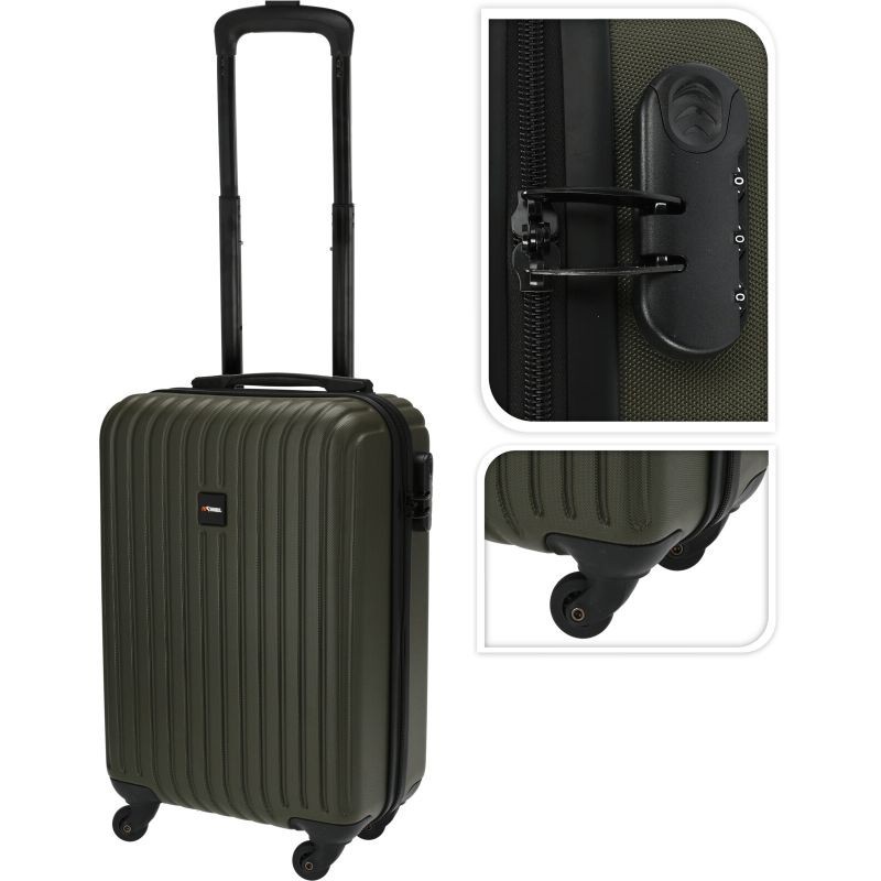 WALIZKA NA KÓŁKACH 18 CALI 28 L, 330X200X520MM, 2,3 KG, OBUDOWA ABS Z MAŁYMI KROPKAMI W KOLORZE KHAKI ZIELONYM, 4 OBROTOWE KÓŁKA, ZAMEK SZYFROWY NA BOKU, RURKA ALUMINIOWA Z UCHWYTEM Z PP ORAZ GÓRNY UCHWYT Z ABS, Z LOGO PRO WORLD W FORMIE NAKLEJKI NA PRZODZIE, WSZYSTKIE ELEMENTY W KOLORZE CZARNYM, WNĘTRZE W PEŁNI PODSZEWIONE W KOLORZE CZARNYM, Z KIESZENIĄ NA ZAMEK W KSZTAŁCIE U ORAZ ELASTYCZNYMI TAŚMAMI. KAŻDY EGZEMPLARZ Z ZAWIESZKĄ, 4 SZT. DOBRZE ZABEZPIECZONE W OPAKOWANIU ZE ZNACZKIEM KOLORU / 330X210X530MM, BRĄZOWE PUDEŁKO/ETYKIETA KOLOROWA FALISTA (BBCL): , 330X200X530MM / CFT 5,18, (1.936/40ft HQ)