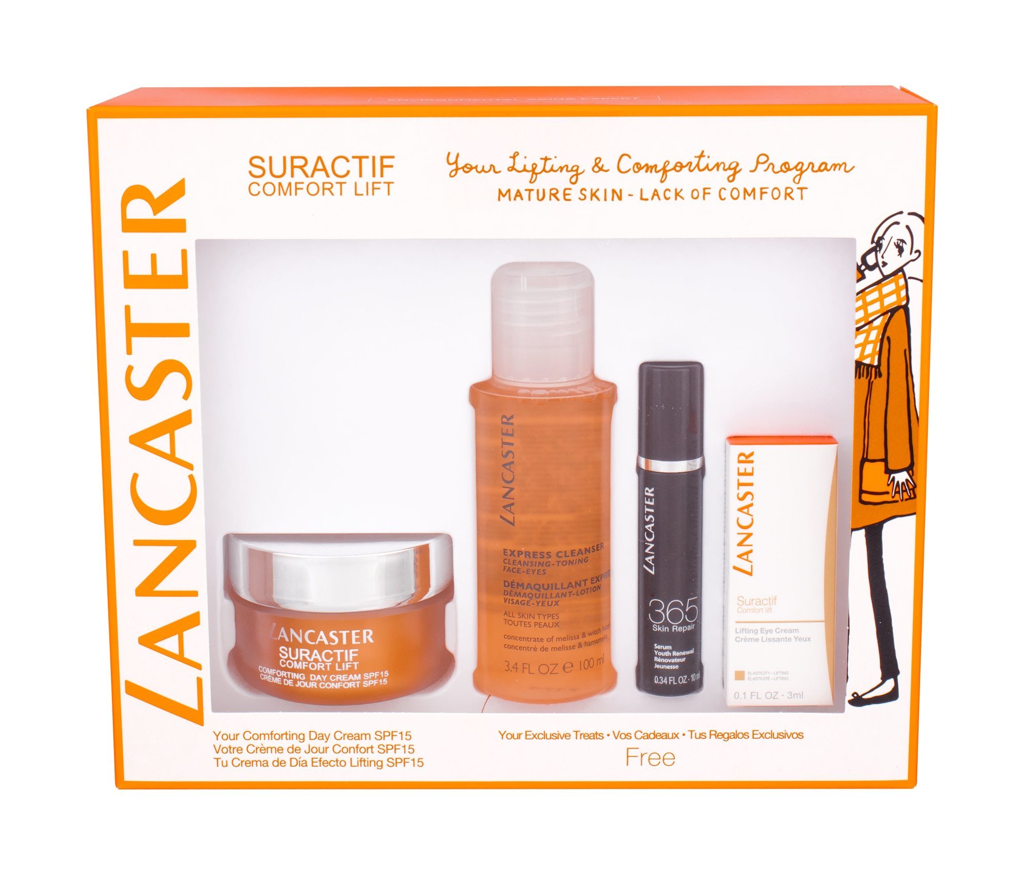 Dárková sada pro všechny typy pleti Lancaster Suractif Comfort Lift.Složení kazety:denní pleťová péče Suractif Comfort Lift SPF15 50 mlDenní pleťový krém s ochranným faktorem chrání pleť před nepříznivými vnějšími vlivy, čímž dokáže předcházet vzniku linek a vrásek. Efektivně zpevňuje pleť....