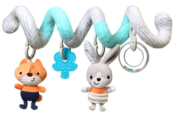 Pluszowa spirala jest wykonana z różnych materiałów, które stymulują dotyk dziecka. Każda z zawieszonych zabawek jest ponadto wyposażona w funkcję grzechotki lub piszczka, aby zapewnić inspirującą zabawę najmłodszym. Kształt spirali umożliwia jej przymocowanie do wózka, łóżeczka lub fotelika samochodowego.