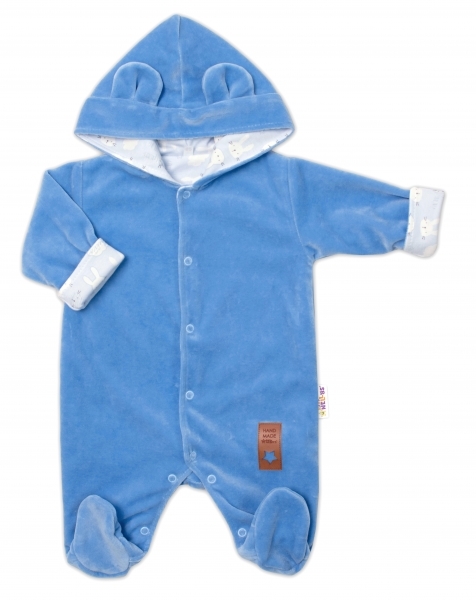 Semiškový, velurový overal s kapucí Baby Nellys New Bunny, modrý; 56 (1-2m)