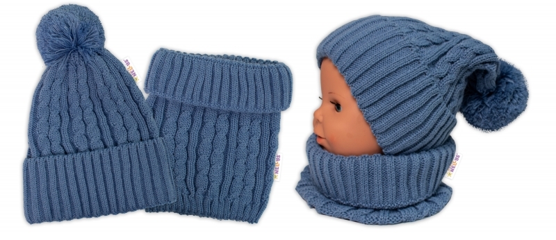 Zimní čepice s bambulí + komínek Baby Nellys - modrá, jeans, vel. 48-52cm; 98-104 (2-4r)