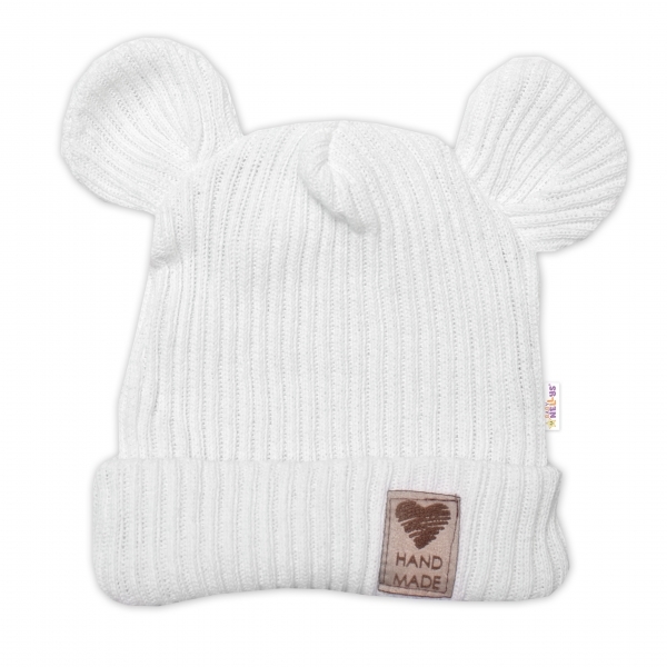 Pletená bavlněná čepice s oušky, dvouvrstvá, Hand Made Baby Nellys, bílá, vel. 80/86; 80/86 (12-18m)