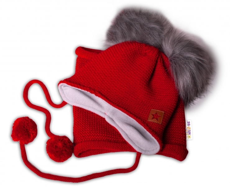 Zimní čepice s fleecem a chlupáčkové bambulky Star + komínek -červená,104/116, BABY NELLYS; 104-116 (4-6r)