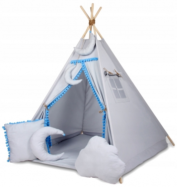 Stan pro děti týpí Baby Nellys + výbava - šedý s modrými bambulkami