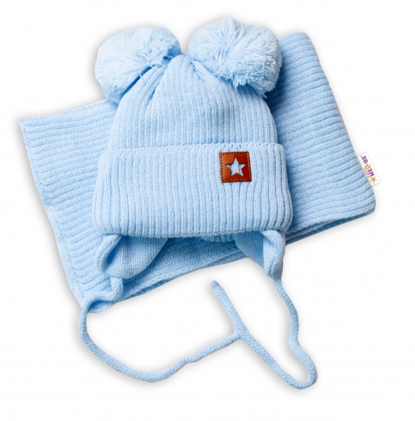 Dětská zimní čepice s šálou STAR - modrá s bambulkami, BABY NELLYS; 56-68 (0-6 m)