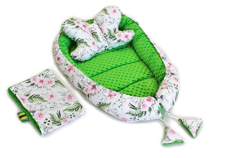 Sada komplet Baby Nellys, oboustranné hnízdečko, 60x90cm - Květinky, minky zelená