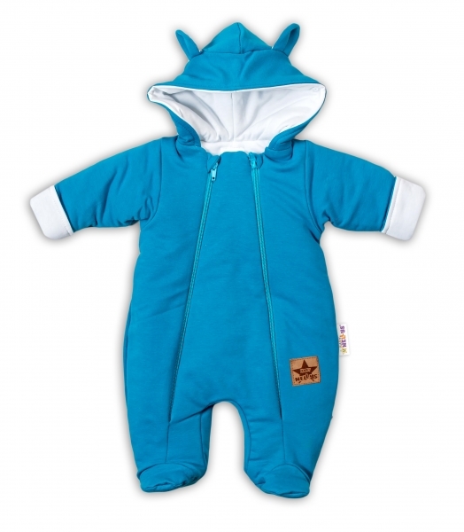 Baby Nellys Kombinézka s dvojitým zapínáním, s kapucí a oušky TEDDY - tyrkysová/petrolej; 56 (1-2m)